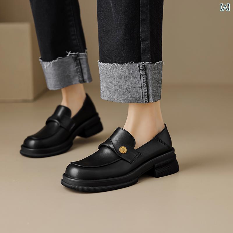 ローファー レディース 通勤 通学 オフィス 学生 厚底 革 英国風 深い メタル バックル 太い ヒール 小さめ 革靴 レトロ シンプル カレッジ スタイル シューズ